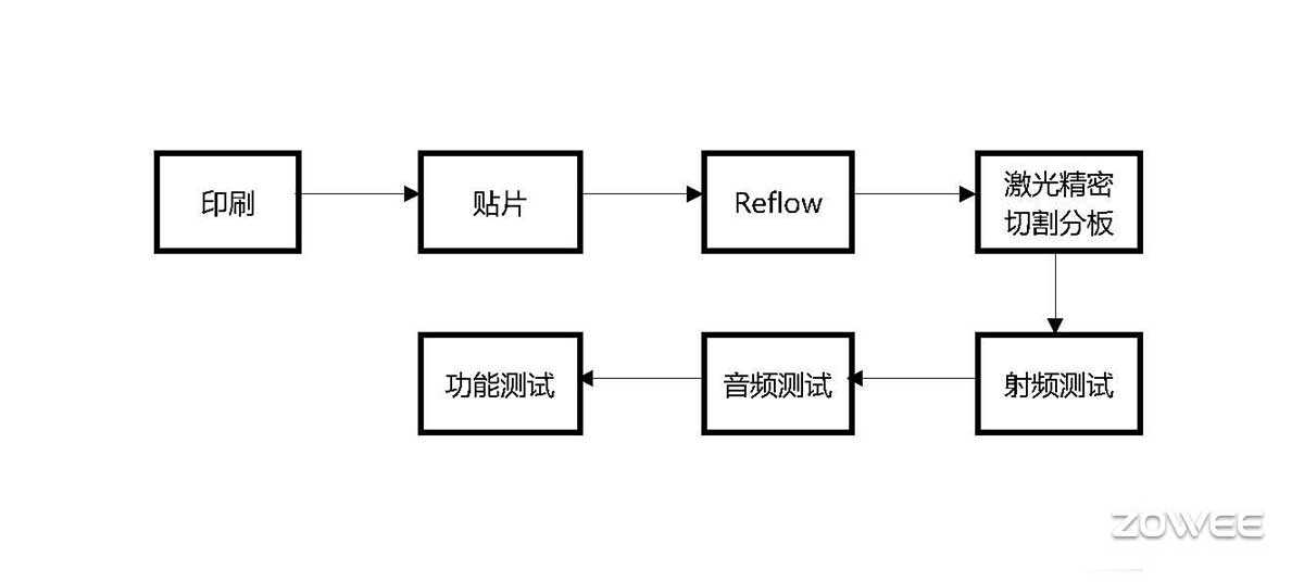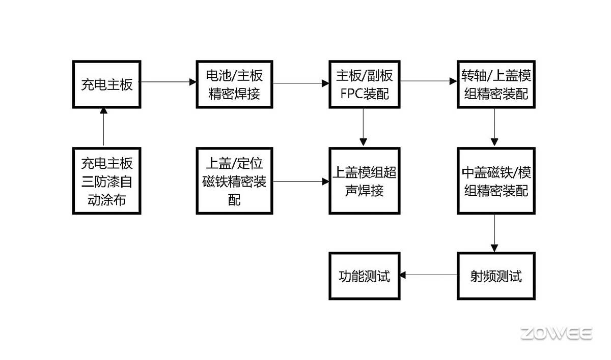 从充电主板三防漆涂布,焊接、主板/副板FPC装配,上盖/转抽装配,中盖装配,射频测试和音频测试。