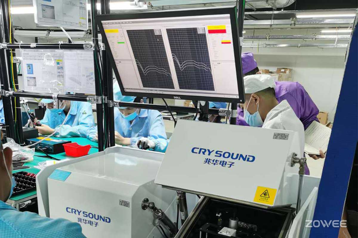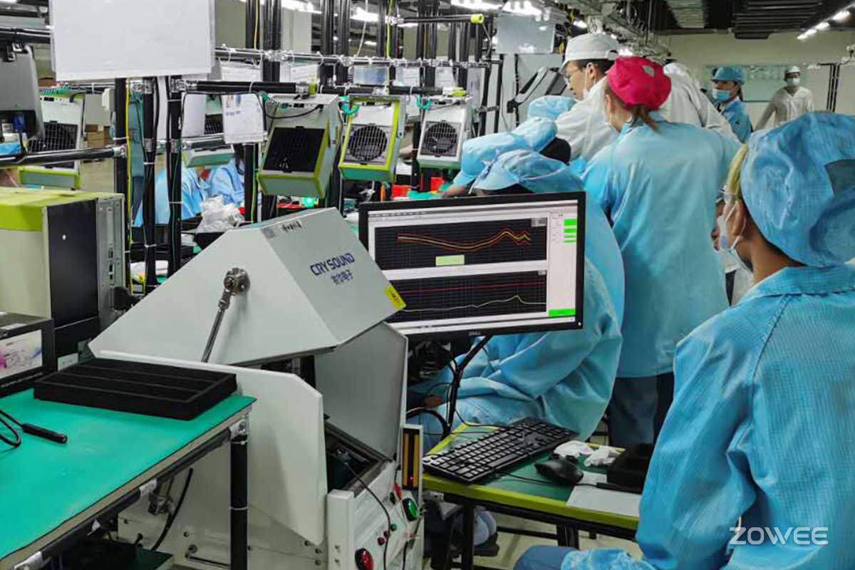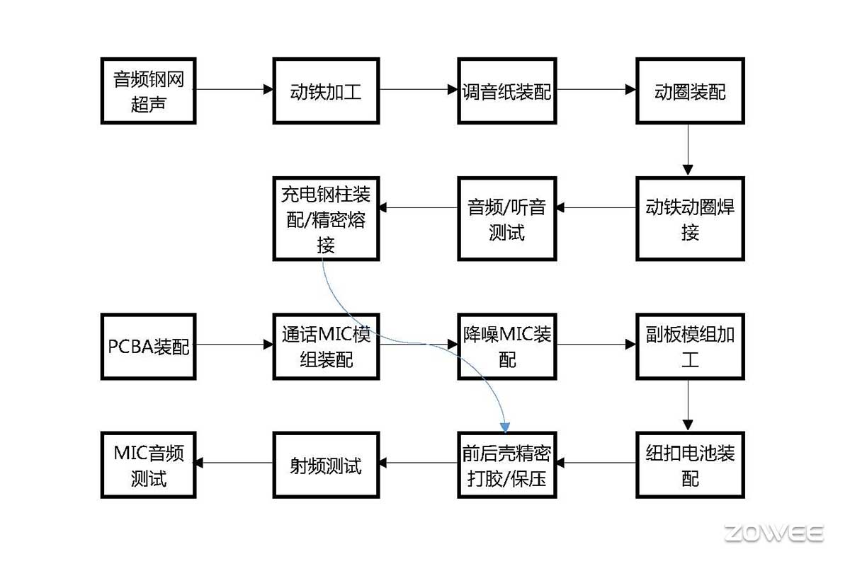 从PCBA的装配,模组装配,动铁动圈,副板模组,纽扣电池装配,前后壳打胶到射频和音频测试,左右耳同步进行。
