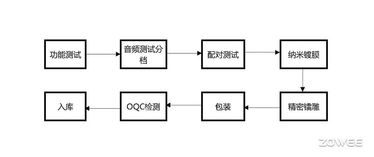 耳机和充电盒都装配好后进行功能测试,音频测试分档,配对测试,镀膜,镭雕,包装,OQC检测,然后入库完成整个生产。